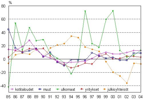 Luottokannan kehitys luotonsaajasektoreittain 1985-2004, muutos edellisestä vuodesta, %
