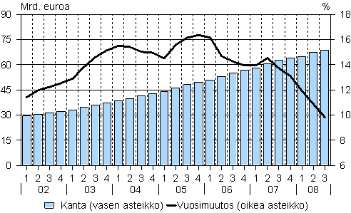 Kotitalouksien asuntoluottokanta (ml. vapaa-ajan asunnot) ja sen muutos edellisen vuoden vastaavasta neljänneksestä neljänneksittäin vuosina 2002-2008