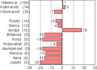 Venäjää lukuun ottamatta Suomeen suuntautuva matkailu väheni kaikista tärkeimmistä matkailijamaista heinäkuussa. Venäläisten yöpymiset lisääntyivät Suomen majoitusliikkeissä peräti 18 prosenttia. Sitä vastoin norjalaisten ja hollantilaisten yöpymisissä oli saman verran vähennystä. Japanilaisten yöpymiset vähenivät viidenneksen vuodentakaisesta. Myös ranskalaisten, brittien ja italialaisten yöpymisissä oli 15 -16 prosentin lasku viime vuoden heinäkuuhun verrattuna.
