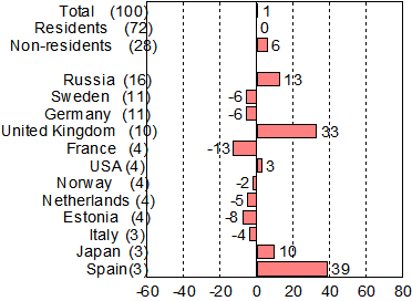 With their 65,000 overnight stays the Russians made up the largest group of foreign tourists in March. The number of overnight stays of Russian tourists grew by 13 per cent when compared with March 2007. Britons had the second highest number, nearly 54,000, of overnight stays. Overnight stays of British tourists increased by 33 per cent from the year before. When compared with March 2007, Spanish tourists' overnight stays increased the most, by 39 per cent. The number of recorded overnight stays of Spanish tourists was 13,600. By contrast, the overnight stays of French tourists decreased by 13 per cent and those of Estonians by 8 per cent from the corresponding period in the year before. The overnight stays of German and Swedish tourists also decreased in March, by 6 per cent from March 2007.