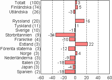 De ryska turisterna var den största gruppen av utländska turister i april 2010. Deras övernattningar uppgick till 46 000 dygn i inkvarteringsanläggningar i Finland. Det var nästan 16 procent mer än året innan. Följande i ordningen var svenskarna med 30 000 övernattningar. Deras övernattningar minskade med något under en procent. Därefter kom tyskarna och de övernattade 24 000 gånger i inkvarteringsanläggningarna, vilket var något under en procent mer än i april förra året. Mest minskade övernattningarna bland turister från Storbritannien, med hela 34 procent. Turismen från Frankrike, Förenta staterna och Nederländerna minskade med 9-12 procent samt från Italien och Spanien med 18 procent. Däremot ökade turismen från Estland och Norge. Esternas övernattningar ökade med nästan 22 procent och norrmännens med 4 procent från året innan.