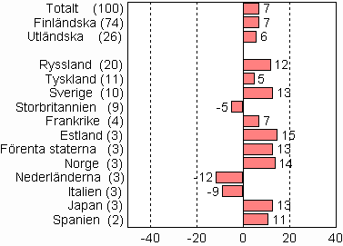 Den största gruppen utländska turister i juli var svenskarna med 117 000 övernattningar. Det var nästan 13 procent mer än i juli 2009. Den näst största gruppen var de ryska turisterna med 106 000 övernattningar, vilket var en ökning med 12 procent från året innan. Den tredje största gruppen var tyskarna med drygt 88 000 övernattningar. Deras övernattningar i inkvarteringsanläggningarna ökade med 5 procent från året innan. Turismen från fjärran länder ökade också kraftigt i juli. Antalet övernattningar av turister från Asien, varav japanernas andel var nästan 40 procent, ökade med 16 procent från året innan. De amerikanska, japanska och norska turisternas övernattningar ökade med 13-14 procent i juli 2010. Bland de länder som är viktigast för Finland ur turistsynvinkel ökade esternas övernattningar mest, med 15 procent. Deras övernattningar i inkvarteringsanläggningar uppgick till 23 000 dygn.