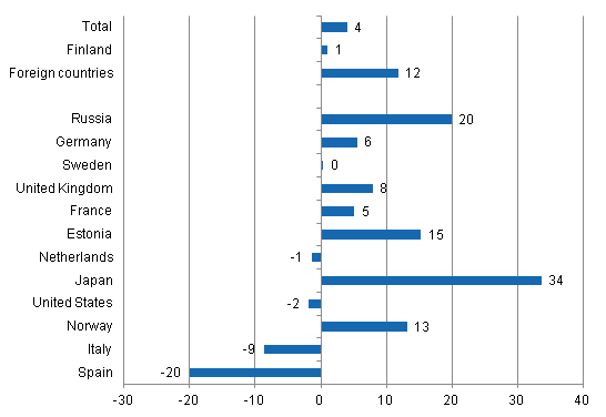Overnight stays recorded at Finnish accommodation establishments for Russian visitors in January-May numbered 672,000, which was one-fifth up on the same period one year earlier. German and Swedish visitors came next. Overnight stays by German visitors increased by 5.5 per cent and numbered 178,000. Night spent by visitors from Sweden at Finnish accommodation establishments numbered 160,000, which was almost the same as in the same period of the previous year. Overnight stays by British visitors numbered 158,000, which was 8 per cent more than in January-May 2011. The number of nights spent by French visitors was 109,000, which was 5 per cent higher than twelve months earlier. The number of nights spent by Estonian visitors rose to 96,000, which was 15 per cent up on January-May 2011. However, the biggest increase of 34 per cent was recorded in overnight stays by Japanese visitors, who spent 65,000 nights at Finnish accommodation establishments.
