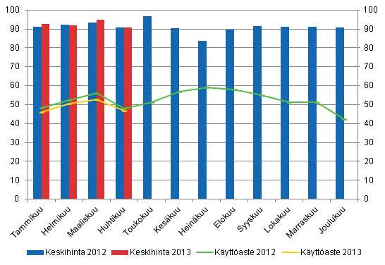 Hotellihuoneen toteutunut keskihinta huhtikuussa 2013 oli koko maan osalta 90,64 euroa vuorokaudelta. Vuotta aiemmin se oli lähes sama, 90,72 euroa.