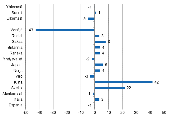 Tärkeimmistä Suomeen suuntautuvista matkailijamaista kiinalaisten yöpymiset lisääntyivät tammi-marraskuussa eniten, 41,7 prosenttia. Heidän yöpymistensä määrä oli runsaat 168 000 vuorokautta. Myös sveitsiläisten yöpymiset ovat kasvaneet voimakkaasti ja heille kirjattiin lähes 148 000 yöpymistä, mikä oli 21,7 prosenttia enemmän kuin vuoden 2014 tammi-marraskuussa.