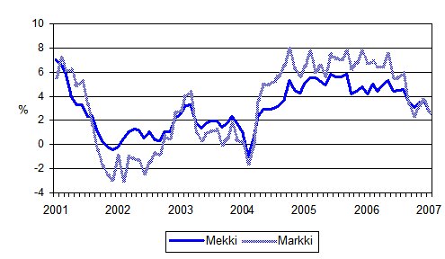 Metsäalan konekustannusindeksin ja maarakennusalan konekustannusindeksin vuosimuutokset 1/2001 - 1/2007