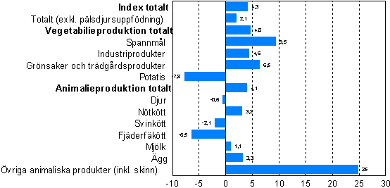 Prisindexet för vegetabilieproduktionen steg med över sjutton procent på årsnivå. Prisindexet för animalieproduktionen sjönk med 0,2 procent, men steg med 2,4 procent exkl. pälsskinn. På stegringen av totalindexet inverkade särskilt dyrare spannmål, grönsaker och trädgårdsprodukter samt dyrare potatis. Under det första kvartalet var priset på spannmål nästan tjugofem procent och priset på potatis femtio procent högre än året innan. Priset på havre steg mest. Priset på pälsskinn sjönk med mer än tio procent. Priset på nötkött steg med mer än fem procent och priset på griskött med nästan fyra procent. Mjölkpriset steg med 0,3 procent.