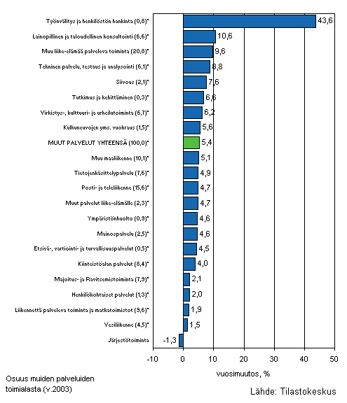 Muiden yhteiskunnallisten ja henkilökohtaisten palveluiden liikevaihto on kasvanut vuodesta 2000 lähtien. Liikevaihdon kasvu on ollut ajoittain melko voimakasta. Kasvu kiihtyi erityisesti loppuvuonna 2004, jolloin kasvuvauhti ylitti 8 prosenttia ensimmäisen kerran 2000-luvulla. Liikevaihdon kasvuun vuonna 2004 vaikutti voimakkaimmin henkilöstöltään toimialan suurimpien (vähintään 250 henkeä työllistävien) yritysten kehitys.