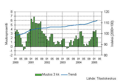 Palvelualojen liikevaihdon kasvun kolmen kuukauden keskiarvo on vaihdellut noin 4-5 prosentin välillä vuoden 2003 syksystä lähtien. Vuoden 2005 ensimmäisellä neljänneksellä liikevaihdon kasvu oli hieman yli 5 prosenttia. Palvelualojen kasvua ovat ylläpitäneet edellisen vuoden tapaan etenkin pienet (alle 50 henkeä työllistävät) yritykset. Liikevaihdon kasvu ei kuitenkaan ole viime vuosina yltänyt vuoden 2000 kasvun tasolle. Lyhyitä hitaamman kasvun vaiheita on viime vuosina ollut kaksi: Ensimmäinen vuosien 2001 ja 2002 vaihteessa ja toinen vuoden 2003 keväällä. Kasvu hidastui tuolloin lähes kaikilla palvelutoimialoilla yhteiskunnallisia ja henkilökohtaisia palveluita lukuun ottamatta.
