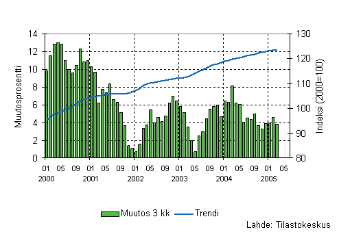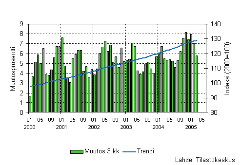 Palvelualojen liikevaihto oli Tilastokeskuksen mukaan vuoden 2005 ensimmäisellä neljänneksellä 5,4 prosenttia suurempi kuin vastaavana ajanjaksona vuotta aiemmin. Edellisen vuoden viimeisellä neljänneksellä liikevaihto kasvoi 5 prosenttia. Palvelualoissa ei ole mukana kaupan toimialoja ja liikevaihto on työpäiväkorjattu poistamalla kalenterista johtuvat vaihtelut.