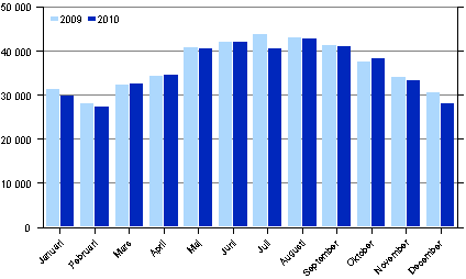 Enligt Statistikcentralens preliminära uppgifter fick polisen, tullen och gränsbevakningen under januari–december år 2010 kännedom om totalt 432 000 brott, vilket är 8 500 fall (2 procent) färre än året innan. Dessutom bokfördes 504 000 fall av äventyrande av trafiksäkerheten och trafikförseelser. Relativt sett ökade brotten mest i Norra Karelen (8 %) och minskade i Päijänne-Tavastland (13 %) och på Åland (22 %). Antalet egendomsbrott uppgick till 247 000, vilket är 8 200 fall, dvs. tre procent färre än år 2009. Polisen fick kännedom om 36 000 brott mot liv och hälsa, dvs. lika många som året innan.