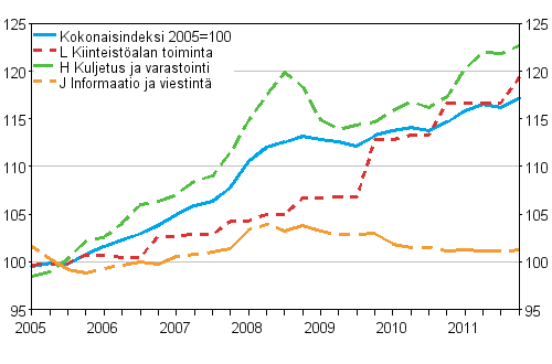 Palvelujen tuottajahintaindeksit 2005=100 (TOL 2008), 4. neljännes 2011