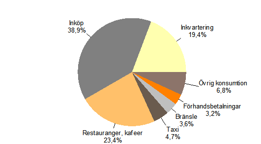 Av de utländska resenärerna var 29 procent på tjänsteresa i Finland och 40 procent på fritidsresa. 12 procent av resenärerna besökte släktingar eller bekanta. De resenärer som var på tjänsteresa lade ut 682 miljoner euro i Finland, fritidsresenärerna 585 miljoner euro. En tredjedel av tjänsteresenärernas konsumtion gick åt till inkvartering, en fjärdedel till restauranger och en femtedel till inköp. Fritidsresenärerna använde däremot rentav hälften av pengarna för inköp, en femtedel för restauranger och kaféer och en tiondedel för inkvartering.