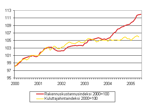 Rakennuskustannusindeksi 2000=100 ja kuluttajahintaindeksi 2000=100