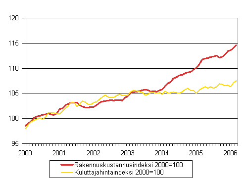 Rakennuskustannusindeksi 2000=100 ja kuluttajahintaindeksi 2000=100