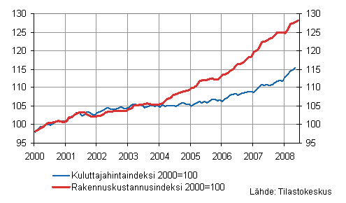 Rakennuskustannusindeksi 2000=100 ja kuluttajahintaindeksi 2000=100