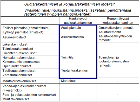 Alla oleva taulukko kuvaa virallisen rakennusluokituksen (talotyyppien) yhteyden rakennuskustannusindeksin 2010=100 laskennan pohjana käytettyihin hanke- ja remonttityyppeihin. Hanketyypillä tarkoitetaan taulukon mukaista kokonaisuutta kuvaamaan muodostettua laskennallista yksikköä.