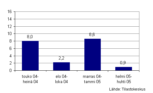 Rakennusyritysten liikevaihto oli helmi-huhtikuussa 2,5 prosenttia edellisvuotista suurempi. Huhtikuun 2005 liikevaihto oli 4,0 prosenttia edellisvuoden huhtikuuta suurempi. Rakennusyritysten liikevaihto lisääntyi vuoden 2003 kesästä alkaen kasvavalla vauhdilla vähennyttyään sitä ennen koko vuoden 2002. Kesän 2004 jälkeen liikevaihdon kasvuvauhti kuitenkin puolittui. Vuoden vaihteessa kasvuvauhti kiihtyi, mutta se johtui ilmeisesti loppulaskutuksista, sillä kasvu näyttää nyt jälleen laantuvan.