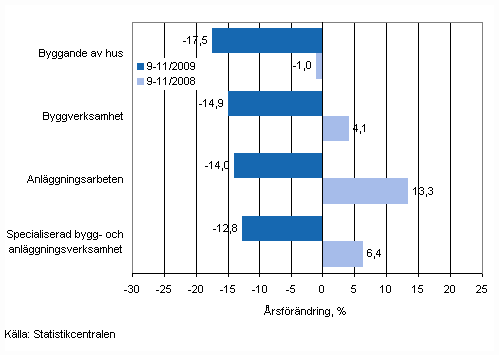 Enligt Statistikcentralen minskade omsättningen inom byggföretagenmed 14,9 procent under september-november år 2009 jämfört med motsvarande period året innan. Omsättningen inom husbyggandet minskade under september-november med 17,5 procent, inom anläggningsarbeten med 14,0 och inom specialiserad bygg- och anläggningsverksamhet med 12,8 procent.