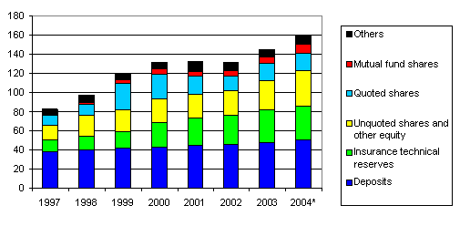 Households' financial assets grew by EUR 14 billion in 2004. During the year, households increased their investments especially in deposits and mutual fund shares. Approximately one half of the growth in the assets came from risen value of investments. At the end of the year, investments in financial assets totalled EUR 159 billion, of which shares accounted for good one third. The proportion of deposits was only fractionally smaller than that of shares. A significant portion of the financial assets was composed of insurance technical reserves in individual life and indemnity insurance, from which households' receivables totalled EUR 35 billion. The share of mutual fund shares of the financial assets was only six per cent.