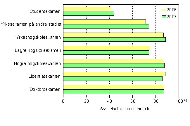 Sysselsättningen bland nyutexaminerade förbättrades år 2007. De nyexaminerade personer som avlagt högskoleexamen hade lättast att få arbete. Av dem hade något under 90 procent arbete i slutet av år 2007. Sysselsättningen ökade nästan inom alla utbildningsnivåer. Sysselsättningen ökade mest i fråga om de nyutexaminerade med yrkesexamen på andra stadiet, dvs. 3 procentenheter. Av dem hade 75 procent ett arbete.