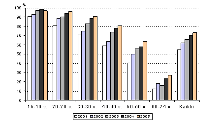 Noin kolme neljästä eli 73 prosenttia ja yli 2,8 miljoonaa 15-74-vuotiasta käytti internetiä keväällä 2005. Internetin käytöstä kysyttiin haastatteluajankohtaa edeltävän kolmen kuukauden aikana. Keväästä 2001 internetin käyttäjäosuus oli kasvanut parikymmentä prosenttiyksikköä. Suhteellisesti eniten osuus on kasvanut yli 60-vuotiaiden joukossa, joiden lähtötaso oli selvästi matalin. Naiset ovat kuroneet miesten etumatkan umpeen internetin käytössä, ja jo 30-49-vuotiaiden ikäryhmässä naisista useampi kuin miehistä käyttää internetiä. Eläkeikäisistä miehet ovat useammin internetin ääressä kuin naiset.