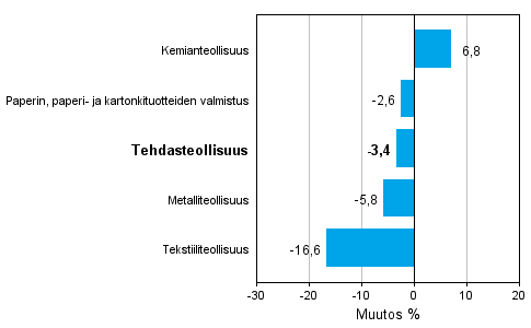 Tarkastelluista päätoimialoista uudet tilaukset vähenivät eniten tekstiiliteollisuuden toimialalla, jolla uusia tilauksia oli 16,6 prosenttia vähemmän kuin vuotta aiemmin. Metalliteollisuuden toimialalla laskua oli 5,8 prosenttia ja paperin, paperi- ja kartonkituotteiden toimialalla 2,6 prosenttia verrattuna vuoden 2012 lokakuuhun. Kemianteollisuuden toimialalla uusien tilausten määrä puolestaan kasvoi 6,8 prosenttia.