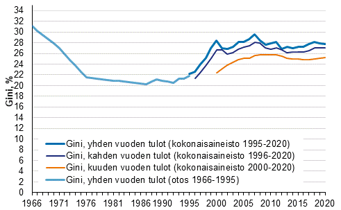 2) Tämän tilaston perusaineisto eli tulonjakotilaston kokonaisaineisto kattaa koko asuntoväestön ja ulottuu taaksepäin vuoteen 1995 asti. Edeltävät tiedot perustuvat kulutustutkimukseen (1966–1981) ja tulonjakotilaston otosaineistoon (1986–1995). Tulonjakotilaston kokonaisaineiston ja otosaineiston välillä on käsite- ja menetelmäeroja, joiden vuoksi Gini-kertoimet eroavat jonkin verran. Liitetaulukossa 1 ja kuviossa 1 on tieto vuodelta 1995 sekä tulonjakotilaston kokonaisaineistosta että otosaineistosta. Lisäksi tulonjakotilaston kokonaisaineiston tulokäsite on kattavampi vuodesta 2010 alkaen. Lisätietoja muutoksesta on laatuselosteen luvussa 6 “Tilastojen vertailukelpoisuus”. Uudella tulokäsitteellä Gini-kerroin on noin 0,3 prosenttiyksikköä pienempi kuin vanhalla.