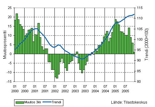 Teollisuuden liikevaihdon kolmen kuukauden liukuva vuosimuutos ja trendi 1/2000-12/2005, 2000=100
