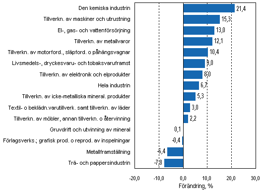 Mest ökade omsättningen under mars-maj inom den kemiska industrin, 21,4 procent, och inom tillverkningen av maskiner och utrustning, 15,3 procent. Ökningen av omsättningen var snabb inom alla undernäringsgrenar av metallindustrin med undantag av metallframställningen. Inom metallframställningen minskade omsättningen med 6,4 procent från året innan. Av de övriga stora näringsgrenarna ökade omsättningen inom energi- och vattenförsörjningen med 13,0 procent, medan den minskade inom trä- och pappersindustrin med 7,8 procent från året innan.