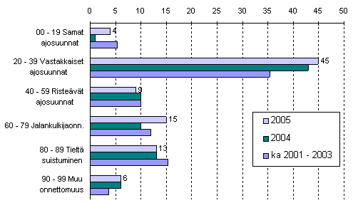 Liikennekuolemia sattui eniten onnettomuuksissa, joissa osalliset ajoivat vastakkaisiin ajosuuntiin. Näissä onnettomuuksissa kuoli 45 ihmistä. Toiseksi eniten kuolemia sattui jalankulkijaonnettomuuksissa, joissa kuoli 15, mikä on 5 enemmän kuin vuonna 2004.