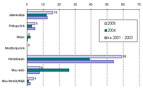 Tieliikenteessä kuolleet tienkäyttäjäryhmän mukaan tammi-maaliskuussa 2005