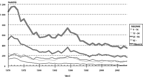Tieliikenteessä kuolleet ikäryhmän mukaan (1970-2008)