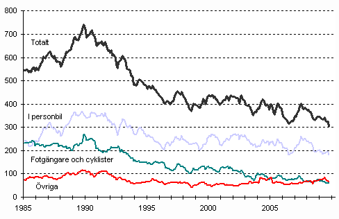 Under januari-oktober var totalantalet vägtrafikolyckor med personskada 5 515. I olyckorna dog 247 och skadades 6 907 personer. Antalet döda var 39 färre och antalet skadade 276 färre än under motsvarande period år 2008. Av dem som dog färdades 148 med personbil, 8 med paketbil, 5 med lastbil, 27 med motorcykel, 9 med moped och 1 med buss. I vägtrafiken dog 22 fotgängare och 18 cyklister. Ytterligare dog 9 andra personer som använde väg.