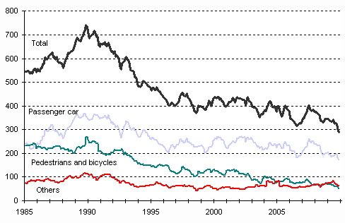 A total of 5 938 road traffic accidents involving personal injury happened in the January to November period. In them, 259 persons were killed and 7 434 persons injured. The number of persons killed was 56 lower and that of persons injured 422 lower than in the corresponding period of 2008. Of the person who were killed, 154 travelled by passenger car, 9 by van, 6 by lorry, 1 by bus or coach, 27 by motorcycle and 10 by moped. Pedestrians killed numbered 24 and cyclists 19. In addition, 9 other road users were killed.