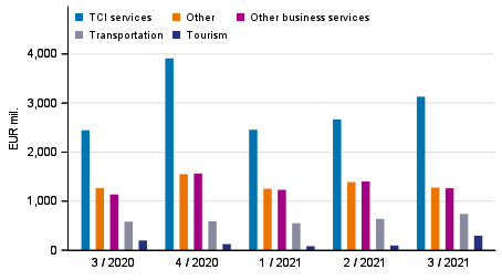 Exports of TCI also underpinned the high level of service exports in the last quarter of 2020, although then its value was higher than that of the past quarter. Thus, the value of TCI exports in the third quarter of 2021 was EUR 3.1 billion. Compared with the previous year, the service item grew by EUR 0.7 billion and by EUR 0.4 billion from two years before. Compared to the third quarter of 2019, the growth in TCI exports compensates for the weaker development of other service items.