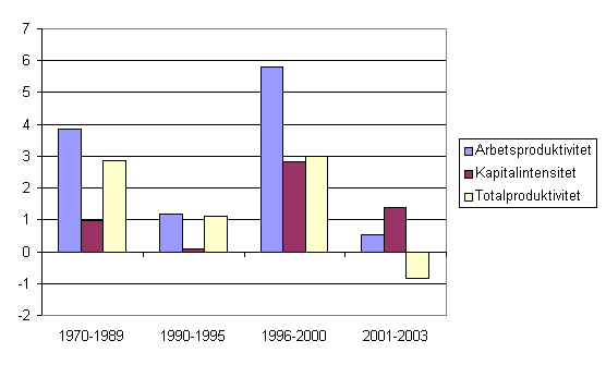 Åren 2001-2003 avtog ökningen av arbetsproduktiviteten, vilket berodde såväl på att bidraget av den kapialintensiva ökningen minskade med 1,4 procentenheter som på att ökningen av totalproduktiviteten vände nedåt. Den genomsnittliga effekten av kapitalintensiteten på arbetsproduktiviteten under perioden 2001-2003 var 1,4 procent i hela samhällsekonomin, medan den under föregående perioder var 1,0 procent under åren 1970-1989, 0,1 procent under åren 1990-1995 och 2,8 procent åren 1996-2000. Den årliga genomsnittliga tillväxten av totalproduktiviteten under perioden 2001-2003 var -0,8 procent i hela samhällsekonomin, medan den under föregående perioder var 2,9 procent under åren 1970-1989, 1,1 procent under åren 1990-1995 och 3,0 procent åren 1996-2000.