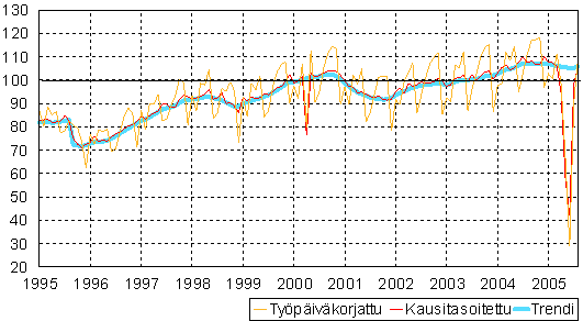 teollisuustuotannon volyymi-indeksi 1995 -2005 elokuu,