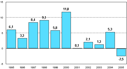 År 2005 sjönk industriproduktionen med 2,5 procent. Industriproduktionen sjönk för första gången på tio år. Arbetskonflikten inom pappersindustrin och den kraftigt ökade energiimporten inverkade för sin del på nedgången av produktionen.