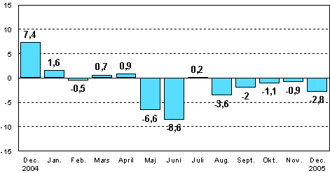 Enligt Statistikcentralen var den säsongrensade industriproduktionen 2,8 procent mindre i december år 2005 än i december år 2004.