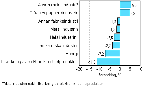 Tillverkningen av elektronik- och elprodukter sjönk mest i december, med drygt 11 procent jämfört med året innan. Energiproduktionen sjönk med drygt 7 procent. Bakom nedgången låg energiimporten, som ökat kraftigt. Produktionen inom den kemiska industrin minskade med närmare 4 procent. Trä- och pappersindustrin ökade, där ökade produktionen med nästan 5 procent. Produktionen inom den övriga metallindustrin ökade också med 5,5 procent. Tillväxten berodde i stor utsträckning på den kraftiga ökningen inom fordonsindustrin.