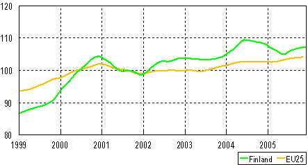 Trenden för industriproduktionen 1999-2005, (Finland och EU25), 2000=100