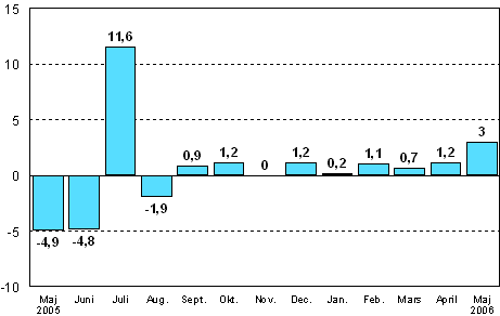 Enligt Statistikcentralen ökade den säsongrensade industriproduktionen med 3,0 procent i maj 2006 jämfört med april. Den säsongrensade industriproduktionsvolymen ökade i maj med 14,6 procent jämfört med maj år 2005. Arbetskonflikten inom pappersindustrin i maj-juni föregående år återspeglas i en ökning av produktionssiffrorna för maj år 2006.