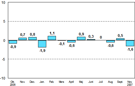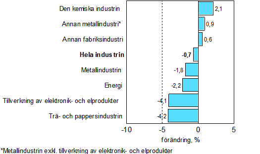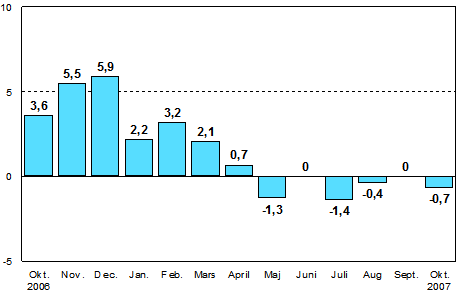 I oktober 2007 var den säsongrensade industriproduktionen enligt Statistikcentralen 0,7 procent mindre än året innan. Av näringsgrenarna var ökningen störst inom den kemiska industrin, övrig fabriksindustri och övrig metallindustri. Produktionen inom trä- och pappersindustrin minskade med drygt 4 procent. Under januari-oktober ökade industriproduktionen med 0,4 procent jämfört med motsvarande period året innan.