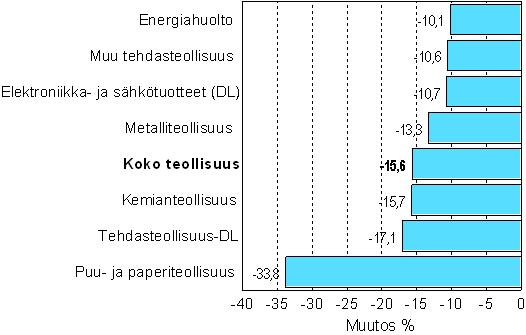 Joulukuussa kaikkien päätoimialojen tuotanto laski. Tuotannon lasku syveni marraskuuhun verrattuna. Joulukuussa metalliteollisuuden tuotanto laski runsaat 13 prosenttia. Eniten tuotanto laski puu- ja paperiteollisuudessa lähes 34 prosenttia.