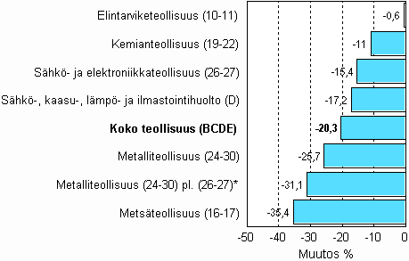 Kesäkuussa kaikkien päätoimialojen tuotanto laski edelleen. Metalliteollisuuden tuotanto putosi lähes 26 prosenttia. Metsäteollisuuden tuotanto laski runsaat 35 prosenttia. Kemianteollisuuden tuotanto väheni 11 prosenttia. Elintarviketeollisuuden tuotanto laski vajaan prosentin.
