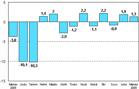 Koko teollisuuden työpäiväkorjattu tuotanto oli Tilastokeskuksen mukaan vuoden 2009 marraskuussa 15,2 prosenttia pienempi kuin vuotta aikaisemmin. Lokakuussa teollisuustuotanto väheni 19,4 prosenttia vuoden takaisesta. Tammi-marraskuussa teollisuustuotanto on vähentynyt 21,7 prosenttia vuoden 2008 vastaavasta ajankohdasta. Teollisuustuotannon pohja on ilmeisesti saavutettu ja kausitasoitettuna tuotanto on kasvanut loka- ja marraskuussa.