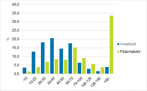 Pääomatulojen osuus tuloista kasvoi selvästi tulojen kasvaessa. Pääomatulojen osuus kaikista veronalaisista tuloista oli 6,5 prosenttia, mutta 75 000–100 000 euroa ansainneilla kymmenen ja yli 100 000 euroa ansainneilla 27 prosenttia tuloista. Vähintään 100 000 euron veronalaiset vuositulot oli 81 200 hengellä eli 1,7 prosentilla tulonsaajista. Heidän tuloistaan 31 prosenttia oli pääomatuloja, 57 prosenttia palkkoja ja kuusi prosenttia yrittäjätuloja. Kaikista pääomatuloista he saivat 45 ja ansiotuloista kahdeksan prosenttia.
