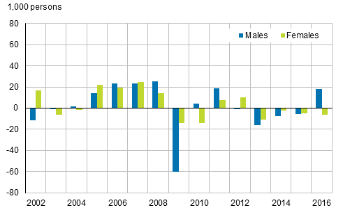 Figure 3. Change from the previous year in the number of employed persons by sex in 2002 to 2016, persons aged 15 to 74