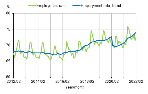 According to Statistics Finland’s Labour Force Survey, the number of employed people was 89,000 higher in February 2022 than one year ago. The number of unemployed persons was 40,000 fewer in February than a year ago. The trend of the employment rate in February was 74.0 per cent and the trend of the unemployment rate was 6.8 per cent.